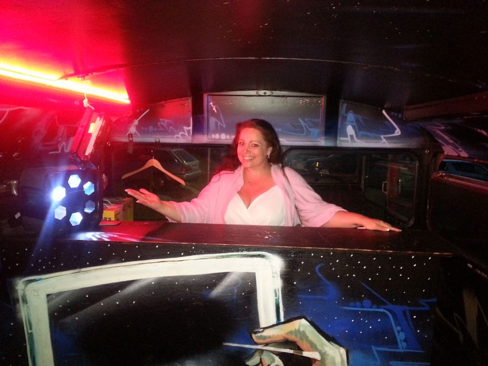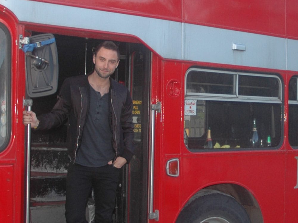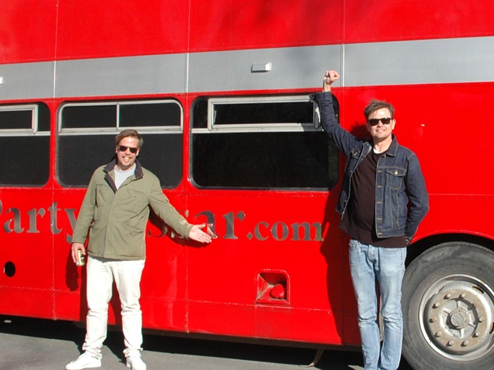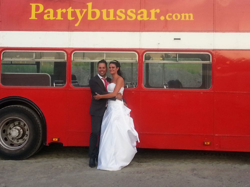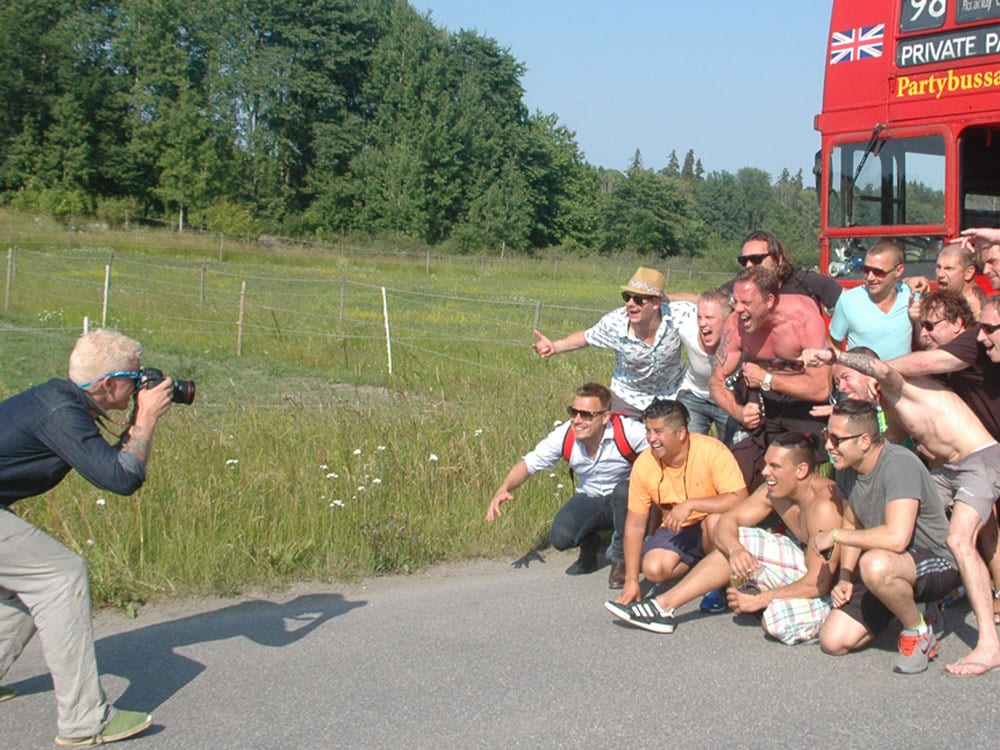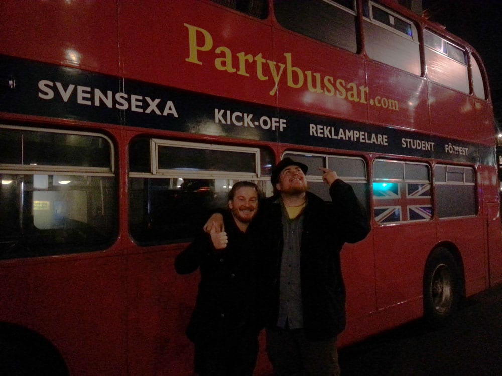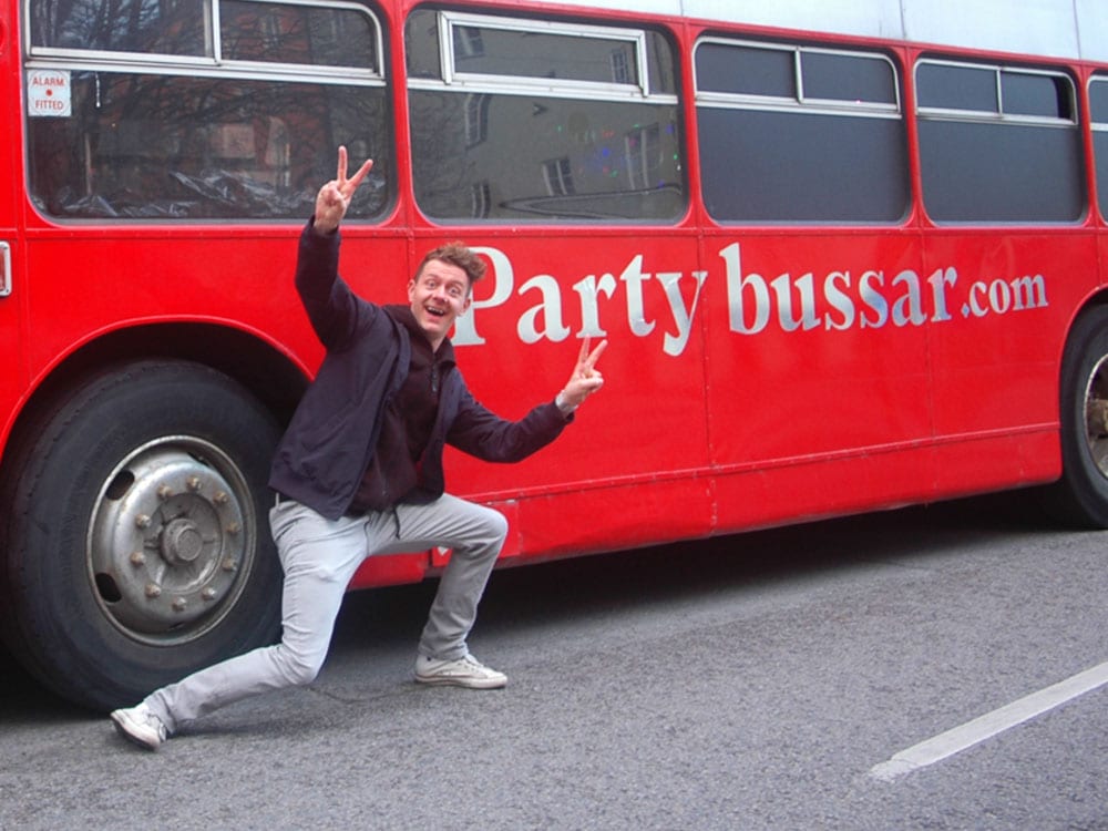 Tobbe Trollar spexar framför bussen